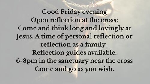The sanctuary will be open from 6-8pm for open reflection at the cross. Come and think long and lovingly at Jesus. This time can be a time of personal reflection or a time for reflection as a family. Come and go as you wish. Reflection guides are available.